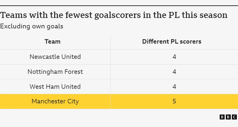 Pencetak gol terbanyak mereka berikutnya di liga adalah gol bunuh diri dengan dua gol, hanya Newcastle United, Nottingham Forest, dan West Ham United yang memiliki pencetak gol lebih sedikit daripada City yang mencetak gol dari lima pemain.