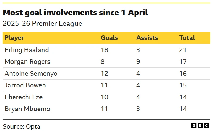 Semenyo memiliki keuntungan tambahan karena dapat memberikan kontribusi gol sendiri saat bermain sebagai pemain sayap. Dengan delapan gol di liga musim ini, hanya Igor Thiago dan Haaland yang memiliki lebih banyak gol.