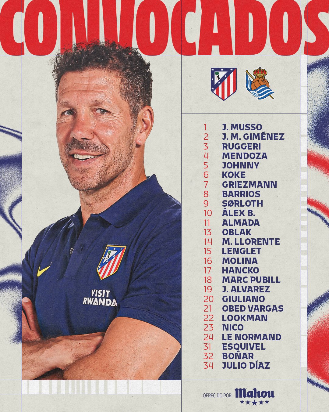 Melengkapi skuad adalah bek sayap Atlético junior , Julio Díaz dan Javier Boñar, yang berkolaborasi mencetak gol tim utama akhir pekan lalu dalam kekalahan 2-1 di Sevilla.