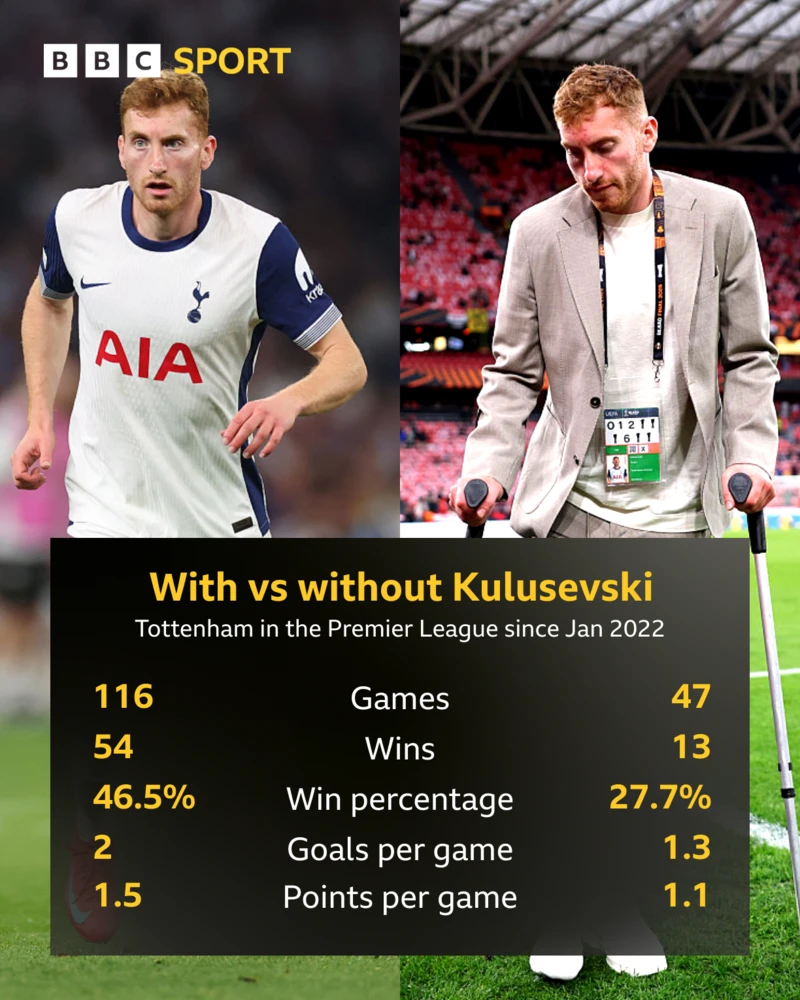 Dejan Kulusevski telah mencetak 25 gol dan memberikan 30 assist dalam 146 penampilan untuk klub sejak kepindahannya dari Juventus, awalnya dengan status pinjaman, pada Januari 2022. Semenjak ia absen, Spurs telah kehilangan kreativitasnya selama 10 bulan terakhir.