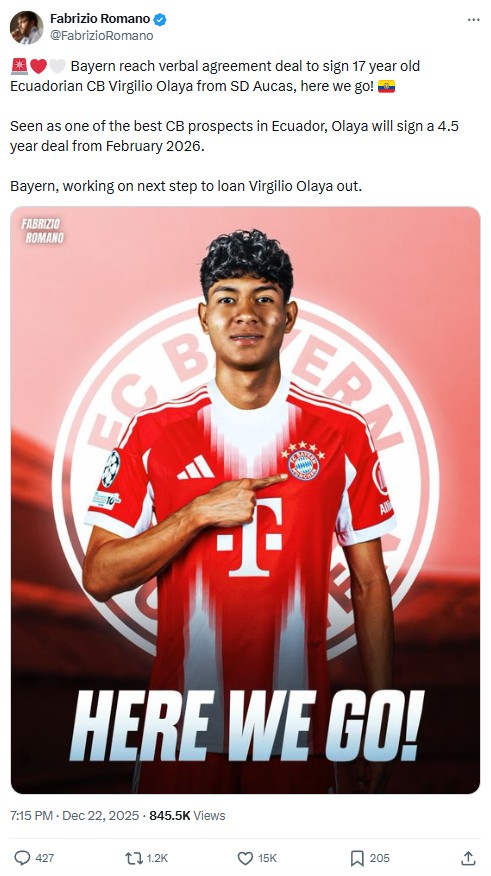 “Bayern mencapai kesepakatan lisan untuk mendatangkan bek tengah muda Ekuador berusia 17 tahun, Virgilio Olaya, dari SD Aucas, mari kita mulai! Dianggap sebagai salah satu prospek bek tengah terbaik di Ekuador, Olaya akan menandatangani kontrak 4,5 tahun mulai Februari 2026. Bayern sedang mengerjakan langkah selanjutnya untuk meminjamkan Olaya,” tulis cuitan Fabrizio Romano di akun X pribadinya, @FabrizioRomano.