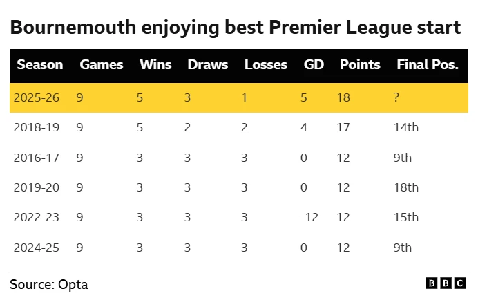 Kemenangan 2-0 atas Nottingham Forest pada akhir pekan lalu membawa klub pantai selatan itu naik ke posisi kedua dalam klasemen setelah sembilan pertandingan, dengan 18 poin terbanyak yang mereka peroleh pada tahap ini.