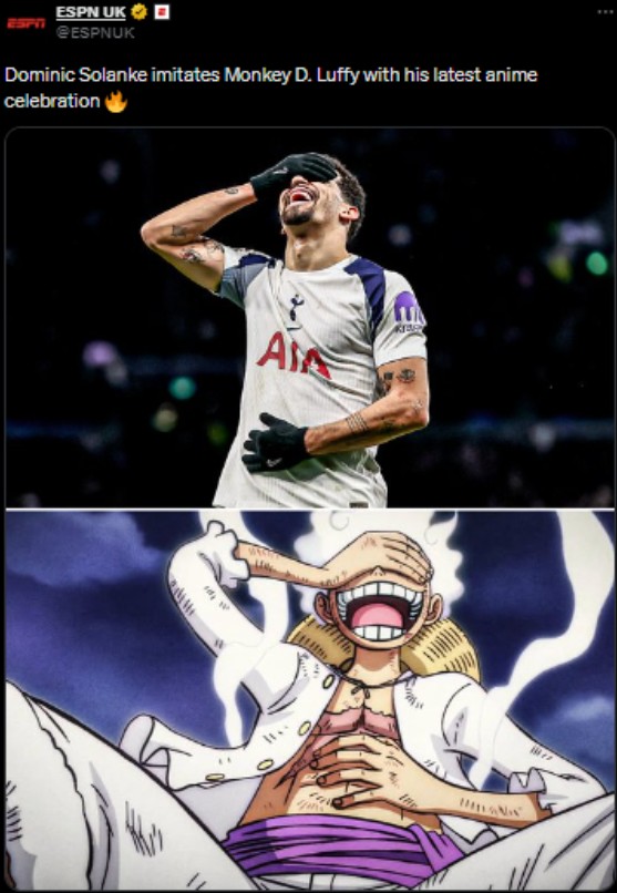 Saking bahagianya, Dominic Solanke sampai melakukan selebrasi dengan menirukan pose Monkey D. Luffy, yang merupakan tokoh protagonis ikonik dari serial anime One Piece.Solanke menutupi matanya, meletakkan tangannya di perut, dan melengkapi pose tersebut dengan tawa teatrikal mirip seperti pose Luffy. Selebrasinya ini pun dengan cepat menjadi bahan pembicaraan warganet.