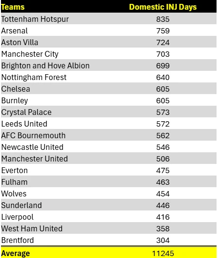 Grafik di bawah ini menunjukkan Tottenham memimpin dalam hal jumlah hari absen akibat cedera pemain, yang menggambarkan masalah yang dihadapi oleh Thomas Frank, yang harus mengatasi absennya pemain dalam jangka panjang termasuk Dejan Kulusevski dan James Maddison.