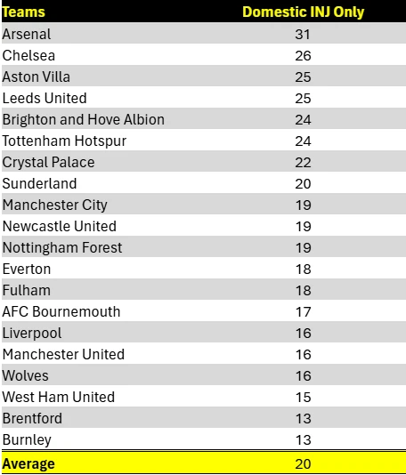 Meskipun tabel ini mencantumkan cedera pemain domestik, tidak mengherankan bahwa tiga tim teratas, Arsenal, Chelsea, dan Aston Villa, semuanya berkompetisi di kompetisi Eropa, dengan The Gunners masih berjuang di tiga ajang dan The Blues menjalani pramusim yang jauh lebih singkat setelah kesuksesan mereka di Piala Dunia Antarklub.