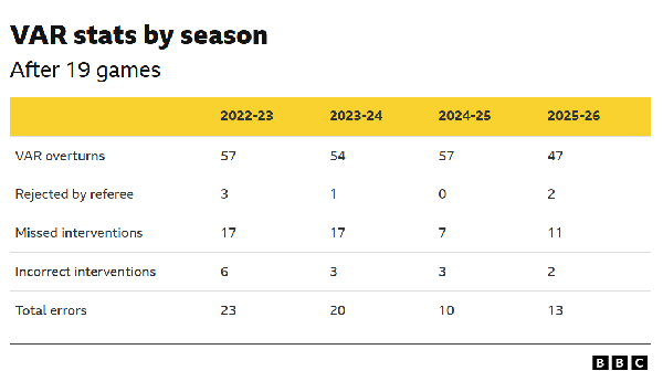 Berita Liga Inggris: Data terbaru dari BBC mengatakan kesalahan asisten wasit video (VAR) meningkat pada paruh pertama Premier League musim 2025/26.