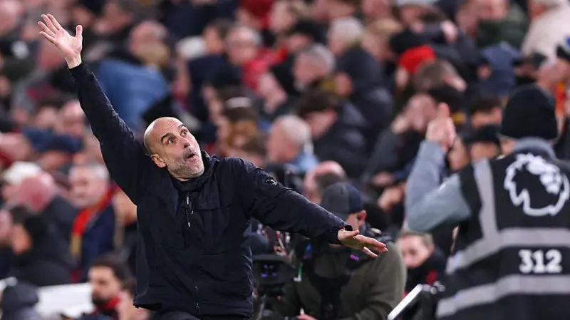 Kualitas penyelamatan tersebut sangat bagus, sampai-sampai pelatih City, Pep Guardiola, terlihat menirukan aksi kipernya di pinggir lapangan - seperti yang bisa Anda lihat pada gambar di bawah ini.
