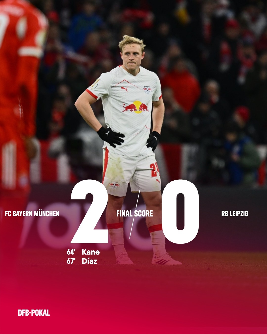Pupus sudah harapan RB Leipzig untuk melangkah jauh di DFB Pokal musim ini. Pasalnya, pada pertandingan perempat final yang digelar di Allianz Arena, Kamis (12/2) dini hari WIB, Die Roten Bulen menderita kekalahan dari Bayern Munich dengan skor 2-0. Dua gol kemenangan Bayern pada ini tercipta melalui penalti Harry Kane di menit ke-64 dan aksi Luis Diaz pada menit ke-67.