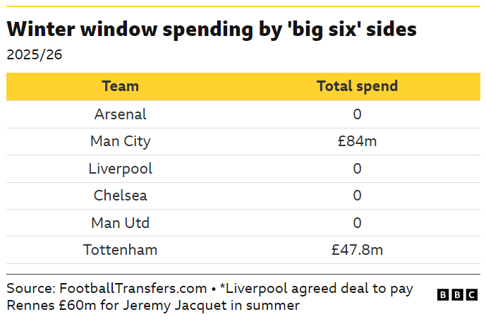 Berikut ini, daftar pengeluaran bursa transfer musim dingin oleh enam klub besar Premier League: