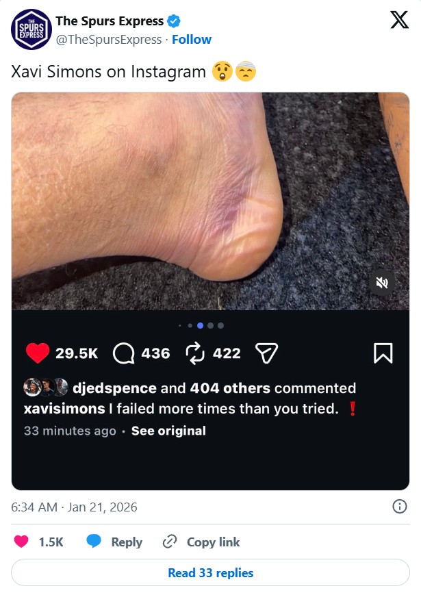 Meski begitu, Simons cukup bersemangat untuk menjalani pertandingan melawan Dortmund di Tottenham Stadium pada Rabu (21/01) dini hari WIB tersebut. Xavi meminta bola sepanjang pertandingan dan bermain dengan intensitas serta kepercayaan diri yang sering kita lihat darinya saat mengenakan seragam RB Leipzig. Ia seakan mengabaikan rasa sakit yang sebenarnya masih ia rasakan, dan setelah laga usai mantan pemain RB Leipzig itu mengunggah foto yang menunjukkan betapa parah cedera kaki yang sebenarnya ia alami.