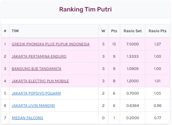 Di bawah Phonska Plus, persaingan papan atas berlangsung ketat. Jakarta Pertamina Enduro dan Bandung bjb Tandamata sama-sama mengoleksi sembilan poin, namun Pertamina Enduro unggul rasio set dan berhak menempati posisi kedua. Megawati Hangestri Pertiwi dkk naik peringkat meski tidak bertanding pada laga penutup seri.